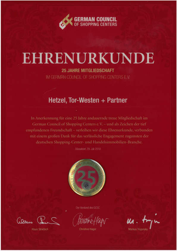 In Anerkennung für eine 25 Jahre andauernde treue Mitgliedschaft im German Council of Shopping Centers e.V.- und als Zeichen der tief empfundenen Freundschaft - verleihen wir diese Ehrenurkunde, verbunden mit einem großen Dank für das verlässliche Engagement zugunsten der deutschen Shopping-Centers- und Handelsimmobilien-Branche.